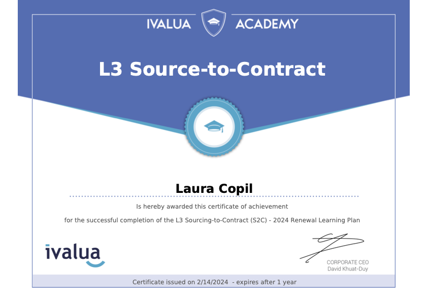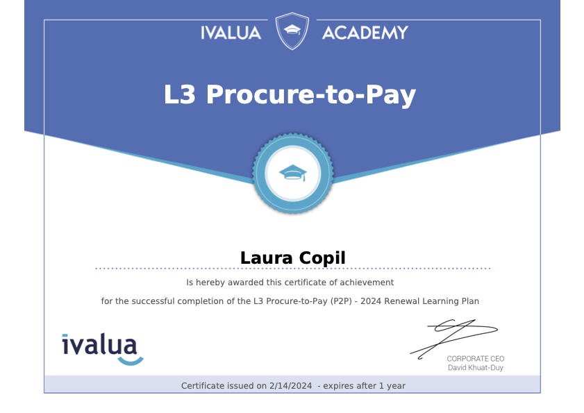 Laura’s professional journey is anchored in a solid foundation, with a background in Accounts Payable and System Admin support, providing her with invaluable insights into the intricacies of financial operations. Her commitment to excellence is underscored by her attainment of Ivalua L3 certifications in both Source-to-Contract and Procure to Pay, signifying her mastery of these critical domains.